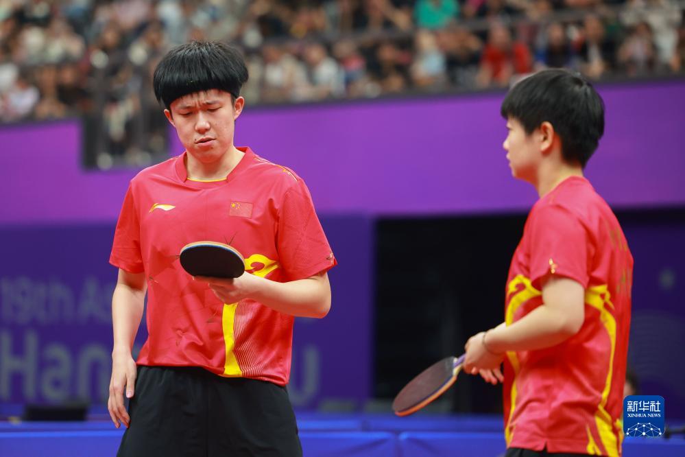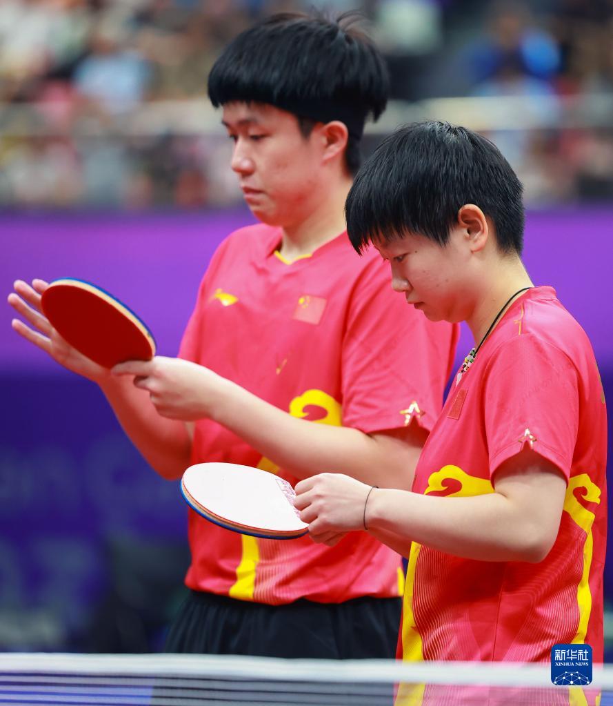 9月27日,王楚欽(左)/孫穎莎在比賽中查看球拍。