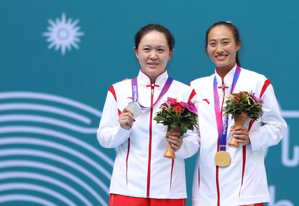 女子網(wǎng)球賽場,兩位中國職業(yè)球員鄭欽文和朱琳攜手為中國隊提前鎖定亞運網(wǎng)球女單五連冠。決賽過后,兩人一同舉起國旗,接受全場歡呼。