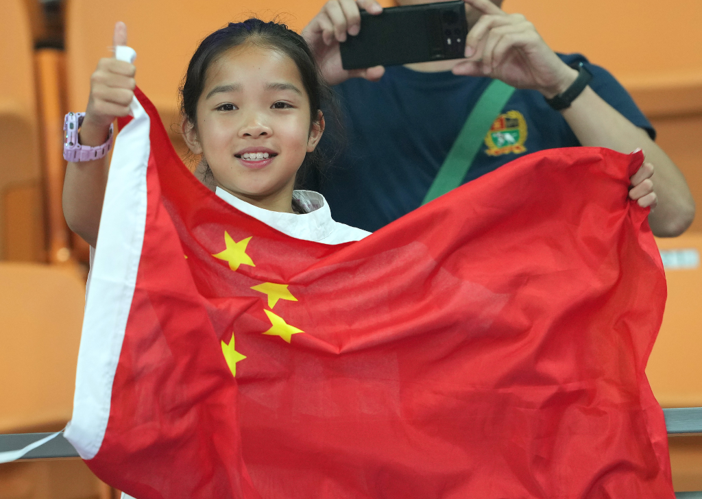 9月27日,觀眾在頒獎儀式上為中國隊選手加油。新華社記者 萬象 攝