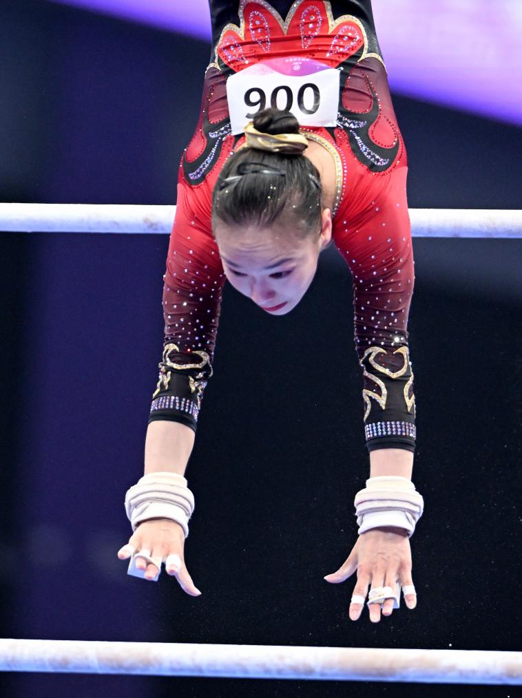9月25日,中國隊選手章瑾在高低杠項目中。新華社記者 程敏 攝