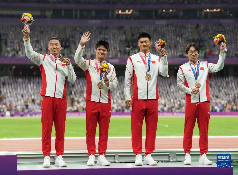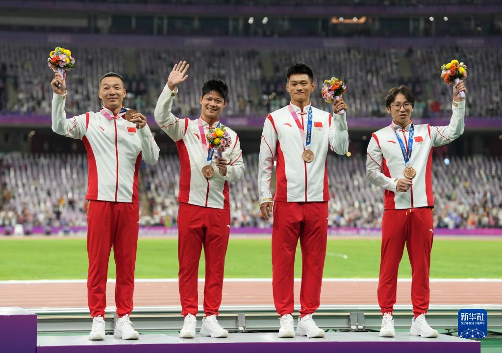 10月4日,湯星強、謝震業(yè)、蘇炳添、吳智強(從右至左)在頒獎儀式后展示獎牌。