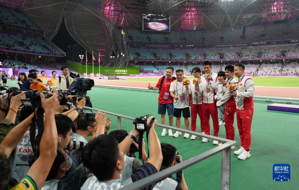 10月4日,湯星強、謝震業(yè)、蘇炳添、吳智強(從右至左)在頒獎儀式后接受采訪。