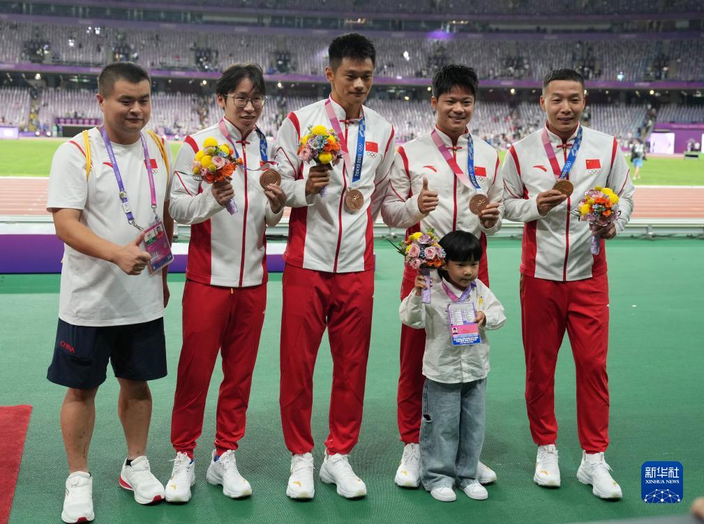 10月4日,湯星強、謝震業(yè)、蘇炳添、吳智強(后排從右至左)和蘇炳添的兒子蘇浩宸(前)在頒獎儀式后。