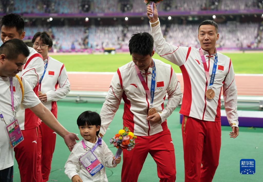 當晚,杭州亞運會田徑項目比賽結(jié)束后,中國奧委會在杭州奧體中心體育場舉行遞補奧運獎牌頒獎儀式,為遞補獲得東京奧運會男子4X100米接力銅牌的蘇炳添、謝震業(yè)、吳智強和湯星強與遞補獲得2012年倫敦奧運會女子20公里競走金、銀、銅牌的切陽什姐、劉虹、呂秀芝頒發(fā)獎牌。