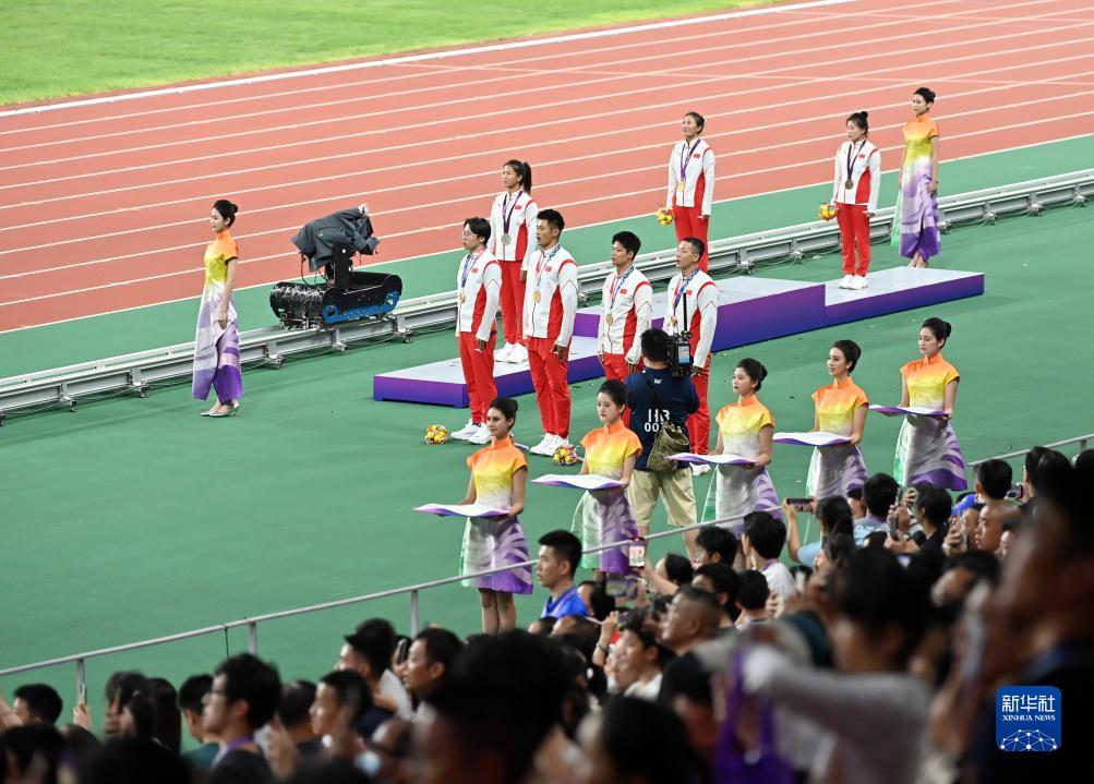 當晚,杭州亞運會田徑項目比賽結(jié)束后,中國奧委會在杭州奧體中心體育場舉行遞補奧運獎牌頒獎儀式。為遞補獲得東京奧運會男子4X100米接力銅牌的蘇炳添、謝震業(yè)、吳智強和湯星強與遞補獲得2012年倫敦奧運會女子20公里競走金、銀、銅牌的切陽什姐、劉虹、呂秀芝頒發(fā)獎牌。新華社記者 江漢 攝