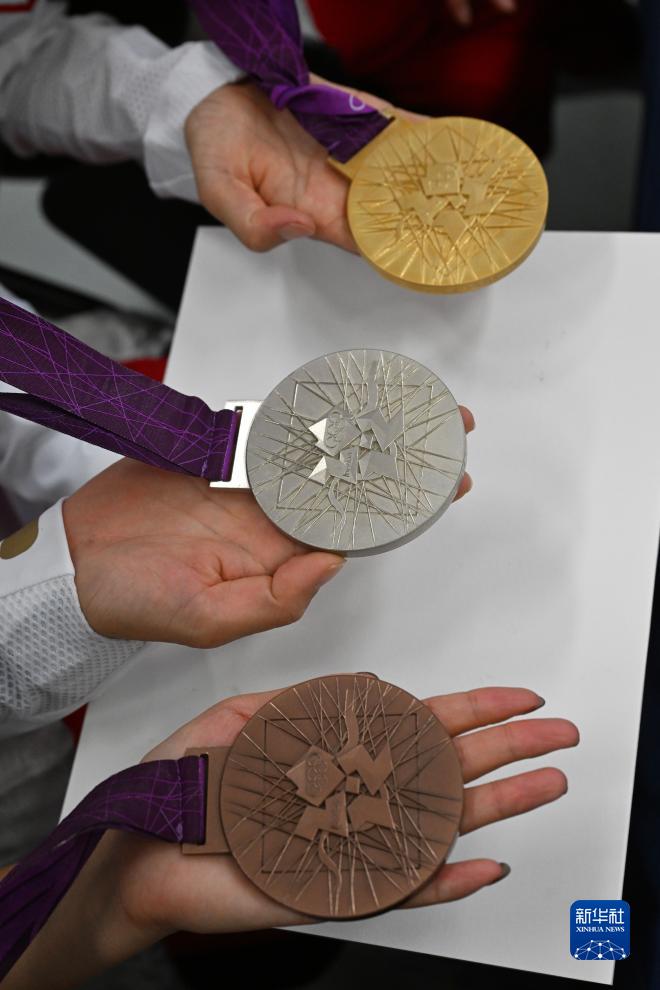 這是切陽什姐、劉虹、呂秀芝遞補獲得的2012年倫敦奧運會女子20公里競走金、銀、銅牌(10月4日攝)。