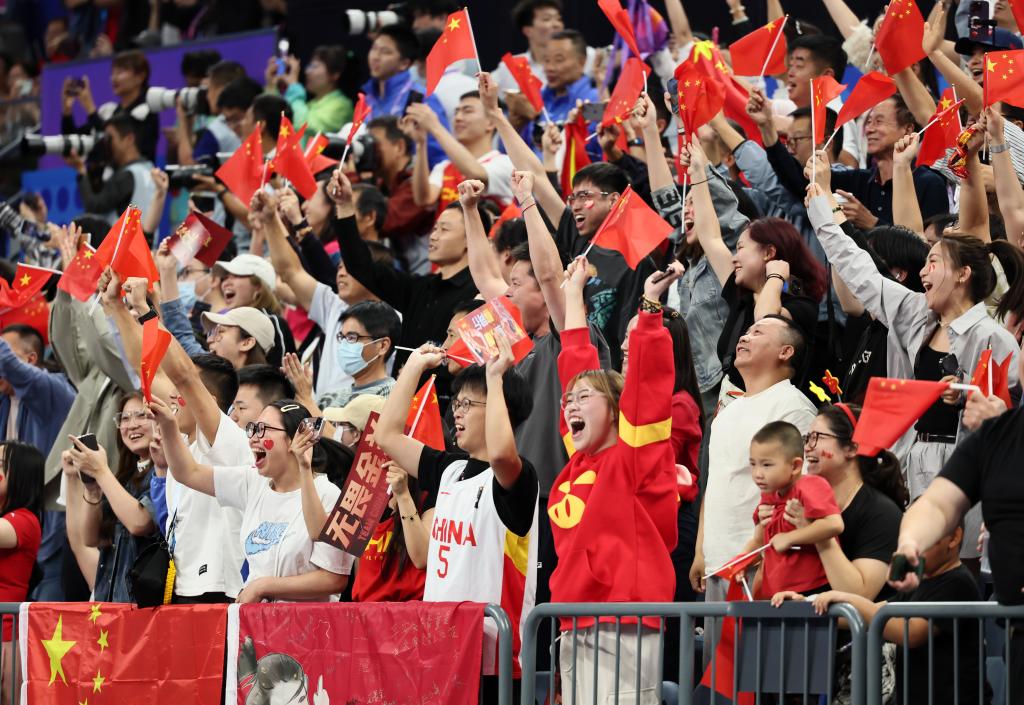 杭州亞運會女籃決賽,觀眾在看臺上為中國隊加油助威。新華社記者蘭紅光攝