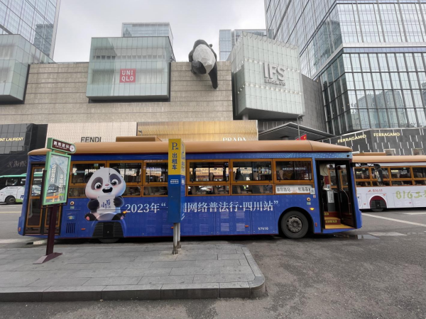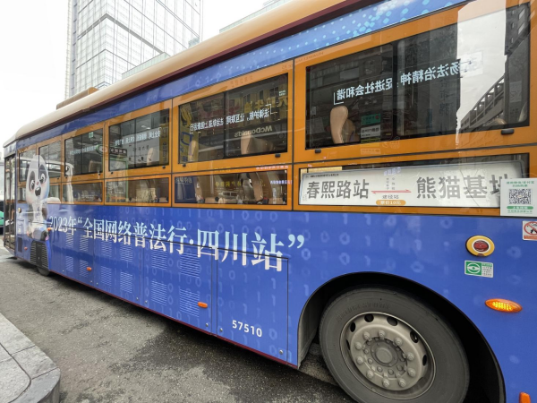 據(jù)介紹,未來一個月時間里,成都市民和來蓉游客都能在春熙路商圈的“網(wǎng)紅”地標“熊貓爬墻”下,看到網(wǎng)絡(luò)普法主題公交。該主題公交在成都著名的“熊貓觀光線”上運行,并往返于成都地標春熙路以及熱門景點熊貓基地,途經(jīng)寬窄巷子、文殊院等人氣打卡地,公交車化身普法“宣傳員”,讓網(wǎng)絡(luò)普法宣傳融入城市交通、深入大街小巷、進入百姓心中。