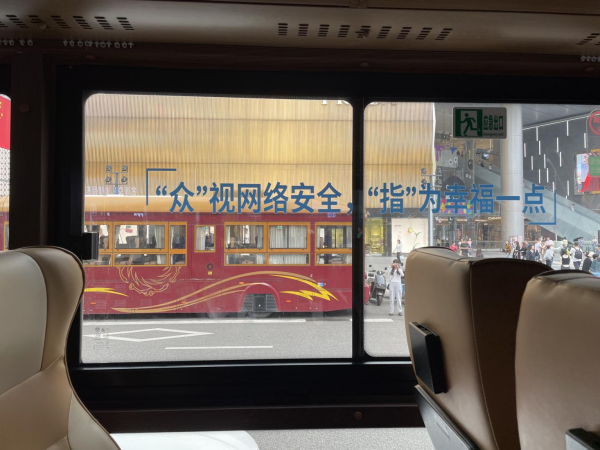 在網(wǎng)絡(luò)普法公交的車窗上,也“隱藏”著網(wǎng)絡(luò)普法金句——“眾”視網(wǎng)絡(luò)安全,“指”為幸福一點!隨著車輛在大街小巷間穿梭,沉浸式學法帶給每位乘客全新的體驗,普法真正“動”了起來。