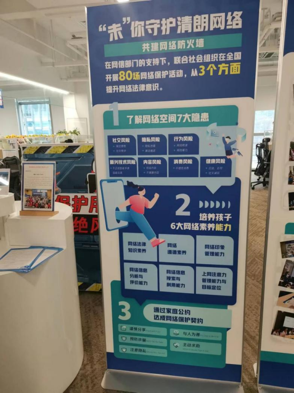 在營地走廊里,兩旁的“條漫展架”以漫畫形式介紹聚焦各種真實的網絡舉報案例,并延展到網絡保護法治宣傳。