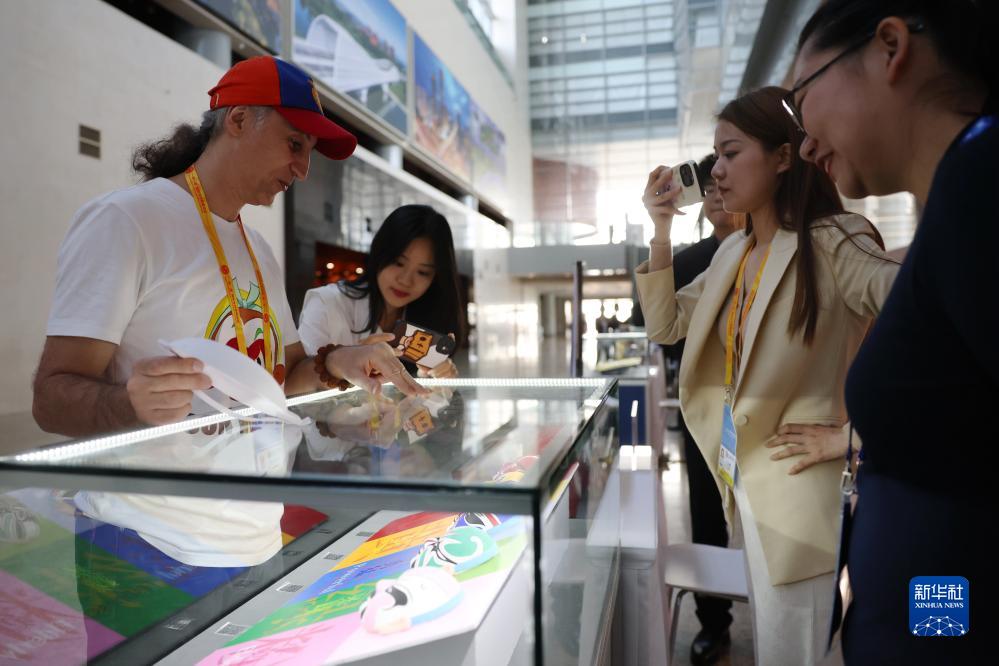 10月16日,參會(huì)記者在“一帶一路”國(guó)際合作高峰論壇新聞中心參觀展示的中國(guó)非物質(zhì)文化遺產(chǎn)展品。