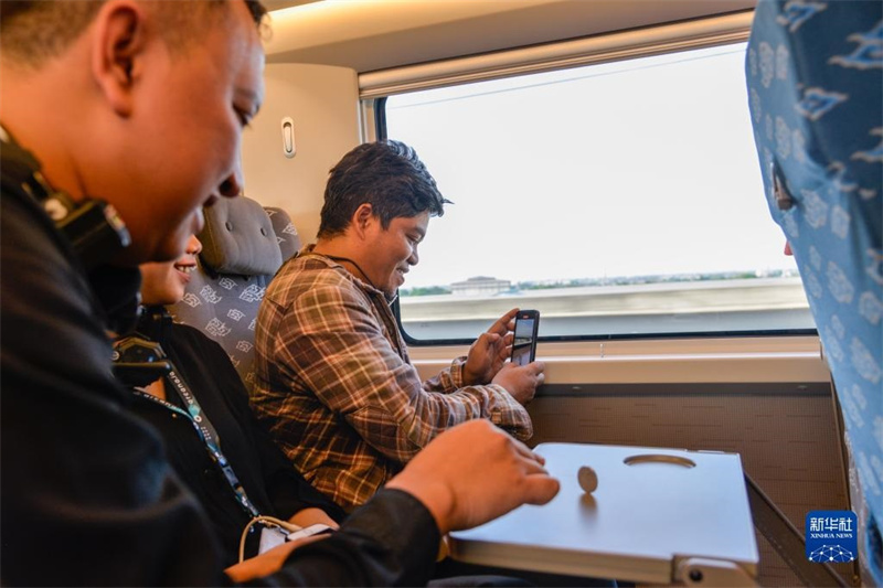 10月17日,乘客在行駛中的雅萬高鐵高速動車組列車車廂內(nèi)拍照。新華社記者 徐欽 攝