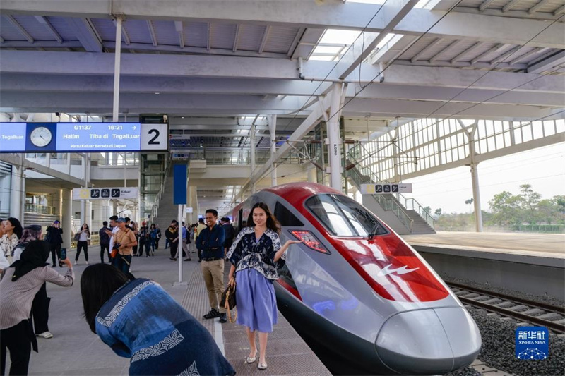 10月17日,在印度尼西亞萬隆德卡魯爾站,乘客在站臺上和雅萬高鐵高速動車組列車合影。新華社記者 徐欽 攝