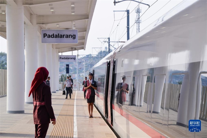 10月17日,在印度尼西亞雅加達(dá)哈利姆站,乘務(wù)人員在站臺歡迎乘客。新華社記者 徐欽 攝