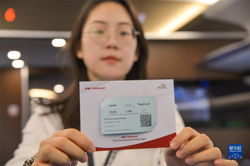 10月17日,乘客在行駛中的雅萬高鐵高速動車組列車車廂內(nèi)展示紀(jì)念車票。新華社記者 徐欽 攝