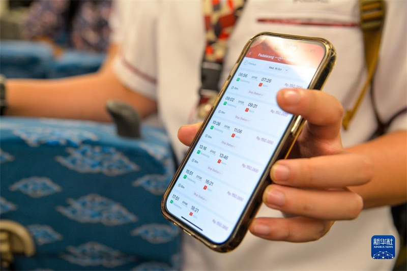 10月17日,一名乘客在行駛中的雅萬高鐵高速動車組列車車廂內(nèi)展示雅萬高鐵購票手機(jī)應(yīng)用。新華社記者 徐欽 攝