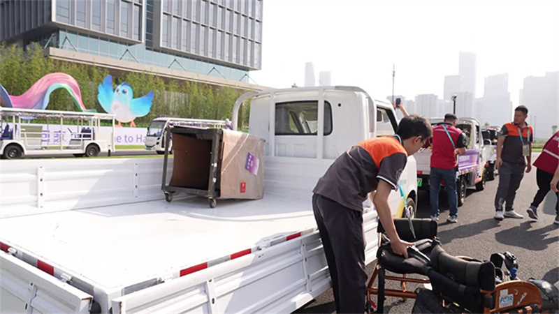 由于殘疾運動員的行李相對較多,大件行李的比例也比較高,還包括輪椅等輔助器具,需要小心保護(hù),不能磕碰,亞殘運村運行團(tuán)隊從各中心緊急抽調(diào)40余名“精兵強(qiáng)將”為運動員提供抵離服務(wù)。大家一方面做好引導(dǎo)工作,陪同運動員和隨隊官員們順利通過安檢,另一方面將隨車行李和行李車上的大件行李搬運下來,運送至行李安檢口。在運動員們進(jìn)行抵達(dá)登記的同時,這些行李已經(jīng)通過了安檢。此時,一條行李運送人力“流水線”形成了:工作人員相互接力,將行李快速運送至“村”內(nèi)行李車。這樣一來,運動員不用奔波勞頓,無需親自動手,體驗“無感服務(wù)”,不知不覺間就與自己的行李一同來到了居住區(qū),美妙的“村生活”即刻開啟。