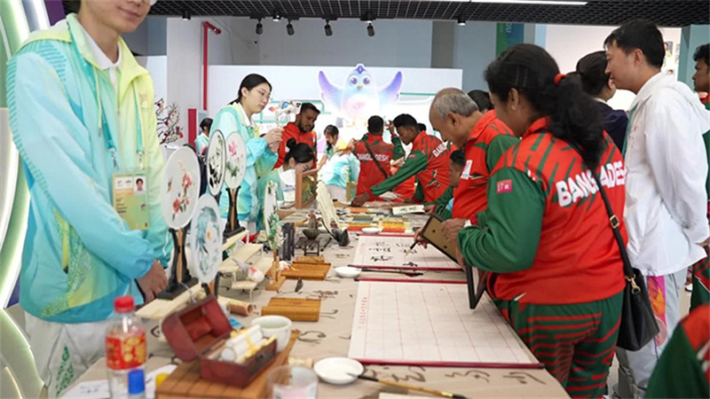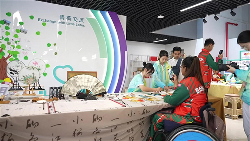 品嘗過美食,想要放松心情,志愿服務(wù)中心是個好去處。孟加拉國代表團(tuán)的運動員們,正在“小青荷”的引導(dǎo)下參觀志愿服務(wù)文化展、體驗各類互動活動。
