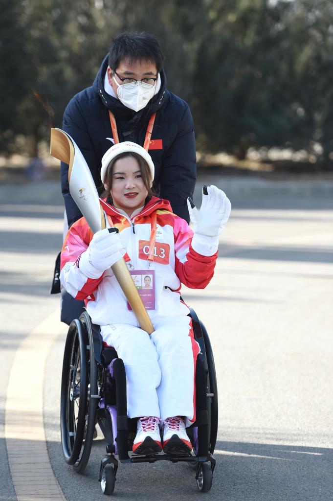 2023年3月2日,北京2022年冬殘奧會(huì)火種采集儀式在張家口市橋東“創(chuàng)壩”園區(qū)舉行,采集“‘氫’潔之火”。郭玲玲作為火炬手在傳遞火炬。新華社記者駱學(xué)峰攝