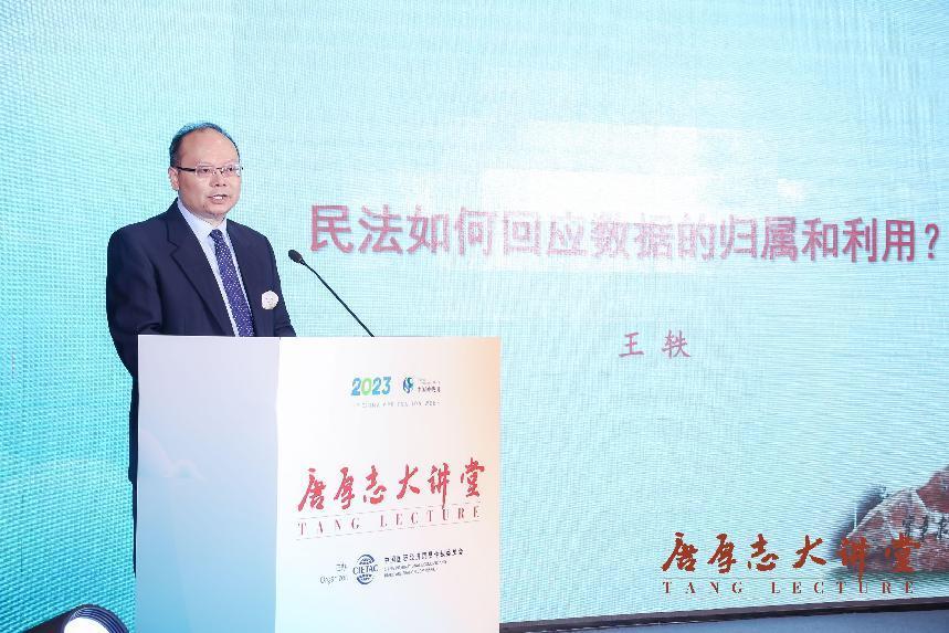 中國人民大學副校長、貿(mào)仲仲裁員王軼以“民法如何回應數(shù)據(jù)的歸屬和利用”為題開展主旨演講。他介紹了數(shù)據(jù)的含義和性質(zhì),援引民法典闡釋了民法上數(shù)據(jù)的內(nèi)涵與外延,剖析了數(shù)據(jù)承載的人身利益、財產(chǎn)利益和民法回應的難題,重點分享了他在數(shù)據(jù)承載利益分配問題上的真知灼見。他表示,建構(gòu)數(shù)據(jù)基礎(chǔ)法律制度是法學界的使命,數(shù)據(jù)立法過程中要注意立法權(quán)、執(zhí)法權(quán)和司法權(quán)的配置。