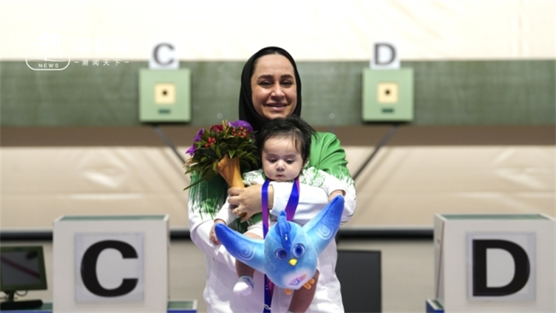 10月24日傍晚,富陽銀湖體育中心,杭州亞殘運會射擊項目SH1級女子10米氣手槍頒獎儀式上,銀牌得主、杭州亞殘運會伊朗代表團射擊運動員薩雷赫?賈萬馬爾迪一出場,就引得現(xiàn)場一片歡呼。