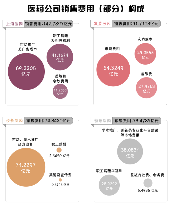 根據(jù)A股中各藥企年報(bào)中披露的數(shù)據(jù)來看,截至2022年底,共有10家藥企的銷售費(fèi)用超過了50億元。整個(gè)行業(yè)中,銷售費(fèi)用最高的是上海醫(yī)藥,達(dá)到了142.7897億元;復(fù)星醫(yī)藥、恒瑞醫(yī)藥、步長制藥等作為化學(xué)制藥、中藥領(lǐng)域的龍頭企業(yè),銷售費(fèi)用分別達(dá)到了91.7118億元、73.4789億元以及74.8421億元。