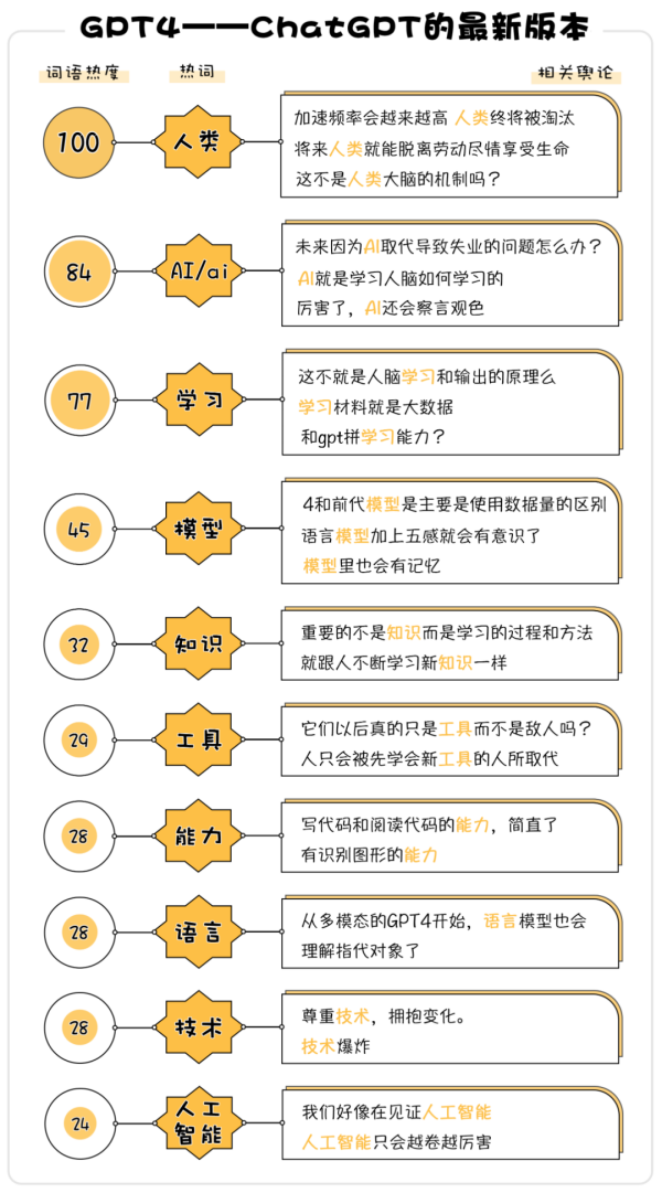 (制作:法治網(wǎng)輿情中心 數(shù)據(jù)來源:在嗶哩嗶哩一則關(guān)于“GPT4會顛覆現(xiàn)有工作流”的視頻中,選取超過10000條彈幕及一級評論,對所選數(shù)據(jù)進(jìn)行NLP分析,將出現(xiàn)次數(shù)最多的詞語規(guī)定為100,以該詞語為基準(zhǔn)對其他熱詞進(jìn)行等尺度放縮,并選取每個熱詞對應(yīng)的輿論做可視化分析)