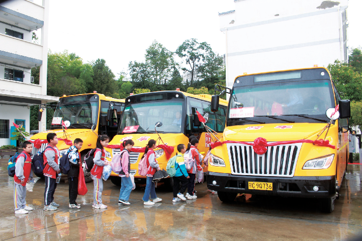 2023年9月28日,湖北省竹山縣校園直通車全域開通后,學(xué)生在有序排隊乘車。新華社發(fā)(楊娟 攝)