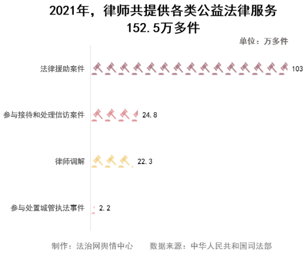 2021年,律師共提供各類公益法律服務(wù)152.5萬多件,其中辦理法律援助案件103萬多件,參與接待和處理信訪案件24.8萬多件,律師調(diào)解22.3萬多件,參與處置城管執(zhí)法事件2.2萬多件。