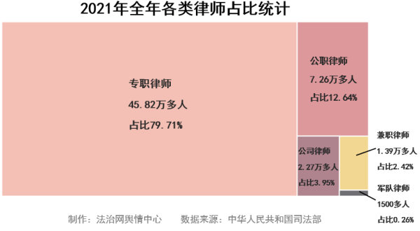 律師隊(duì)伍中,大體分為五類:專職律師、公職律師、公司律師、兼職律師、軍隊(duì)律師。截至2021年底,專職律師占比最高,達(dá)79.71%。公職律師、公司律師、兼職律師、軍隊(duì)律師分別占比12.64%、3.95%、2.42%和0.26%。