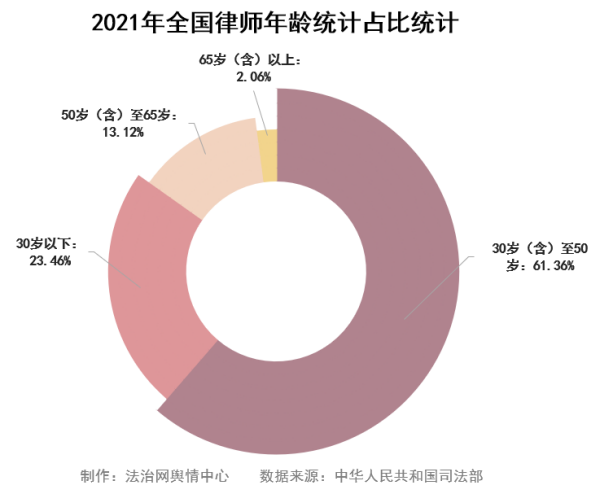 從年齡結(jié)構(gòu)來看,律師行業(yè)處于老中青共存階段。其中,30歲-50歲律師占比最高,達(dá)61.36%,30歲以下律師占比達(dá)23.46%,律師隊(duì)伍年輕化趨勢明顯。
