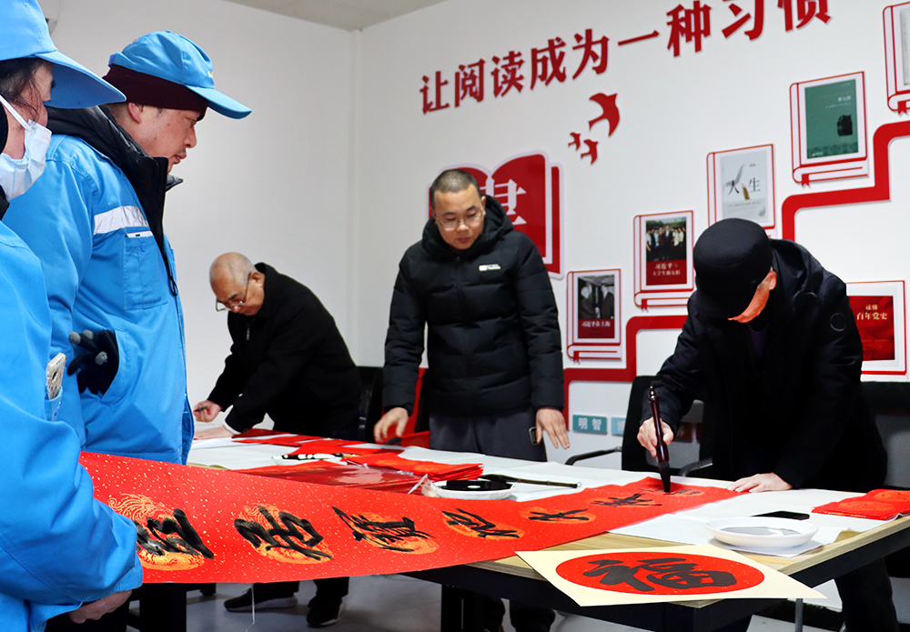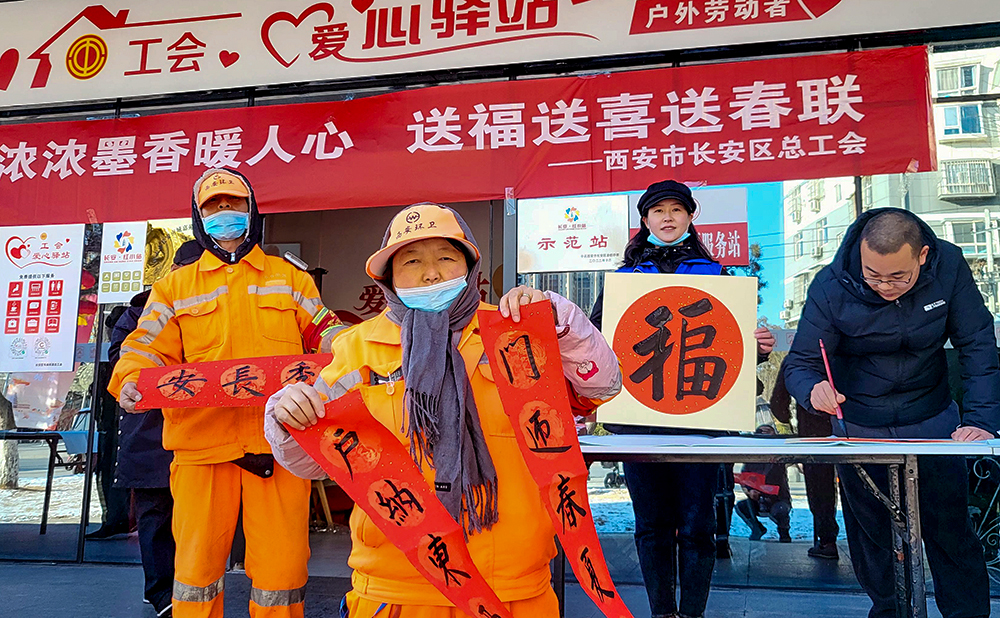 活動(dòng)現(xiàn)場(chǎng),長(zhǎng)安區(qū)總工會(huì)邀請(qǐng)的多位知名書法家現(xiàn)場(chǎng)揮毫潑墨,把對(duì)新春的美好愿望傾注筆尖,書寫出一副副寓意美好、包含祝福的春聯(lián)和“福”。驛站周邊的環(huán)衛(wèi)工人、停車收費(fèi)員,快遞小哥及市民群眾,高興地挑“?!弊帧⑦x春聯(lián),提前感受到了濃濃的“年味”