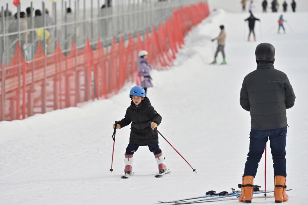 游客在位于羅莊子鎮(zhèn)的薊州溶洞景區(qū)冰雪世界體驗滑雪。新華社記者宋為偉 攝