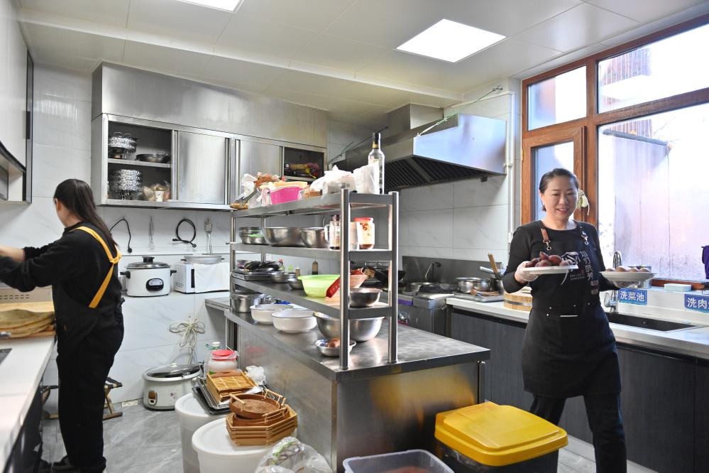 潘娜(右)在她的“知歸曉苑”民宿廚房為客人端出早餐。新華社記者宋為偉 攝