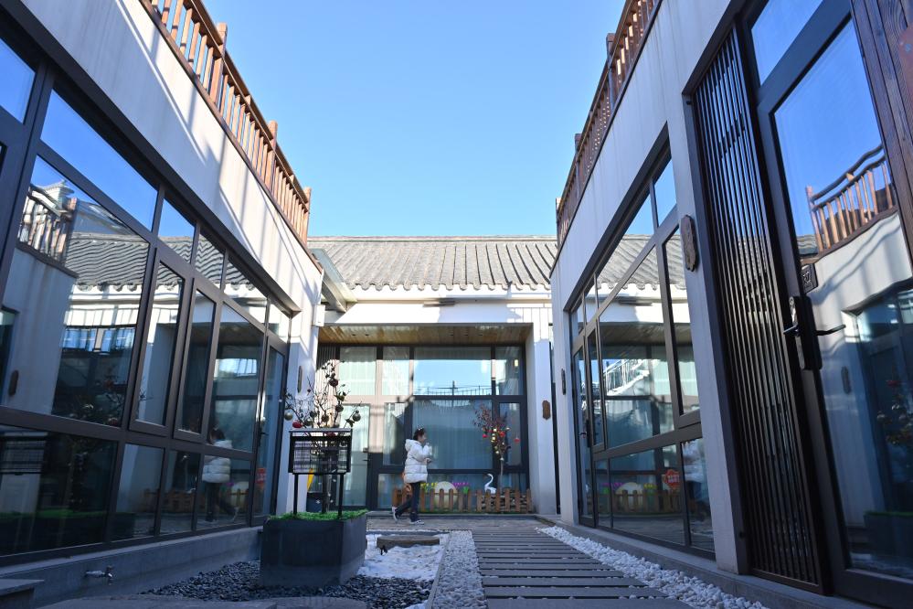 潘娜的民宿坐落在山腰上,是2年前由他們自家的房子改建而成。白墻灰瓦的外觀除了新一些,與村里其他房子并無差異。走進傳統(tǒng)的木門,鋪著鵝卵石、擺放著磨盤的庭院精致而整潔,穿過2米多高的落地門窗走進溫馨舒適的客房,智能家居系統(tǒng)自動開始工作,播放輕音樂的同時拉開了窗簾,鋪著地暖的房間溫暖如春。如果不是窗外蓋著白雪的遠山和田野,幾乎讓人忘記了身處在冬季北方大山深處的村落之中。