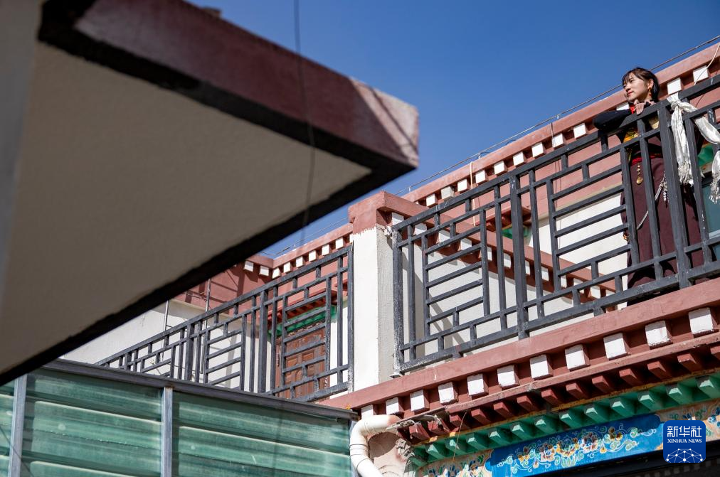 丹增在森布日生態(tài)搬遷安置點(diǎn)的新家陽臺上看風(fēng)景(1月24日攝)。