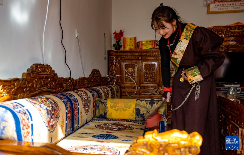 丹增在森布日生態(tài)搬遷安置點(diǎn)的新家打掃房間(1月24日攝)。