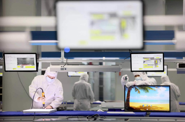 在合肥市瑤海區(qū)的中國網(wǎng)谷,一家電子科技公司的員工在智慧顯示屏生產(chǎn)線上作業(yè)。新華社發(fā)(解琛攝)