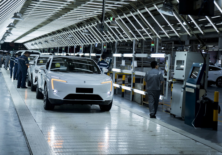 在重慶市長安汽車生產(chǎn)基地車間內(nèi),新能源汽車阿維塔生產(chǎn)下線。新華社記者李前磊 攝
