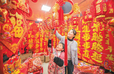 1月28日,江蘇省宿遷市宿豫區(qū)商貿(mào)城新年飾品賣場紅紅火火,年味十足;市民忙著挑選春節(jié)飾品,準(zhǔn)備過年。徐江海攝(人民圖片)