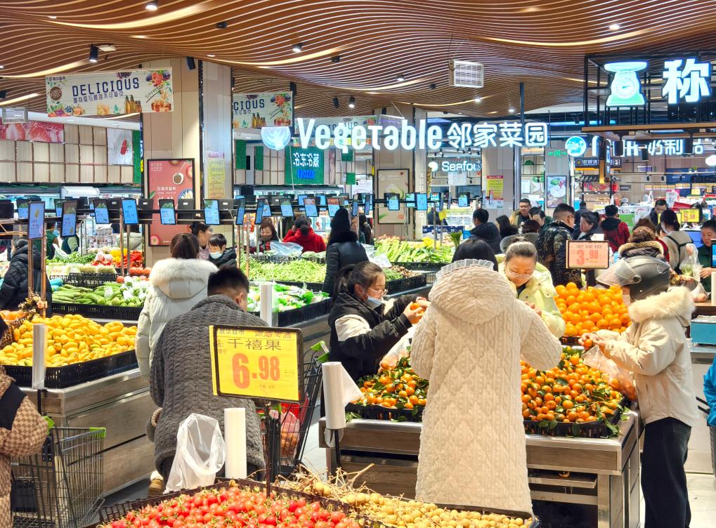 2月2日傍晚,安徽省滁州市鳳陽縣的一家大型商超內(nèi),人們正在生鮮食品區(qū)選購。新華社記者郭晨 攝