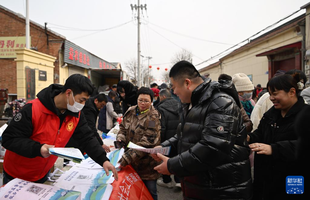 2月4日,天津市武清區(qū)英東泓業(yè)社會(huì)工作服務(wù)中心的志愿者在太子務(wù)大集上發(fā)放倡導(dǎo)文明行為的傳單。