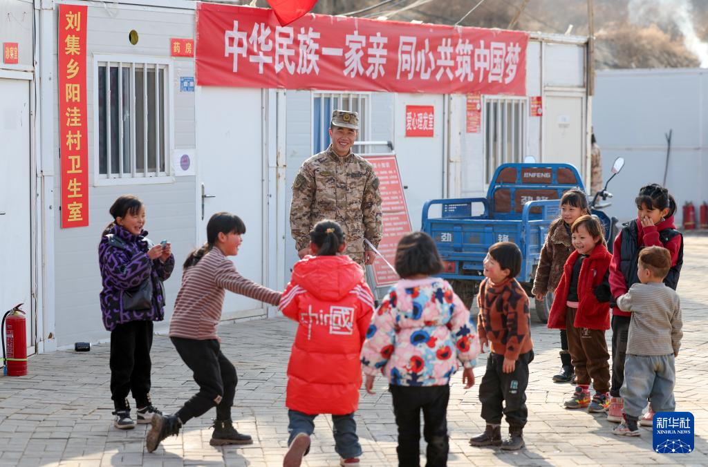 在甘肅省積石山縣陽洼村,武警甘肅總隊臨夏支隊?wèi)?zhàn)士和小朋友做游戲(1月30日攝)。新華社發(fā)(侯崇慧 攝)