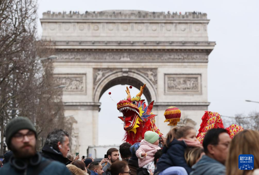 2月4日,人們在法國巴黎香榭麗舍大街觀看舞龍舞獅表演。