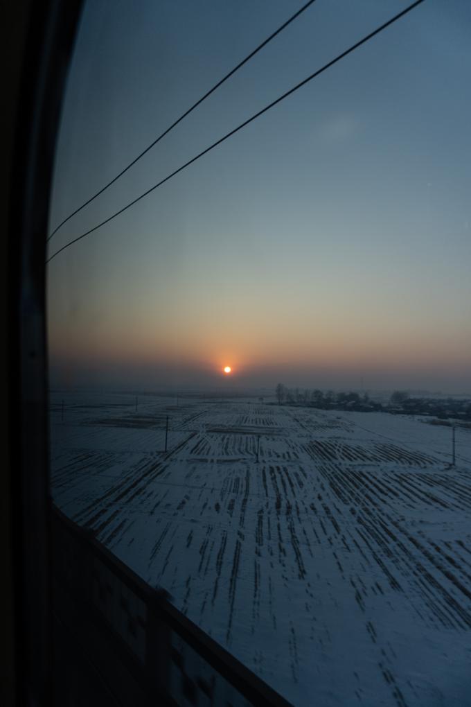 列車漸行漸北,夕陽(yáng)在樺樹枝丫間穿梭,積雪把田間的秸稈垛覆蓋得只露了個(gè)頭兒,車門也開始結(jié)出霜花。