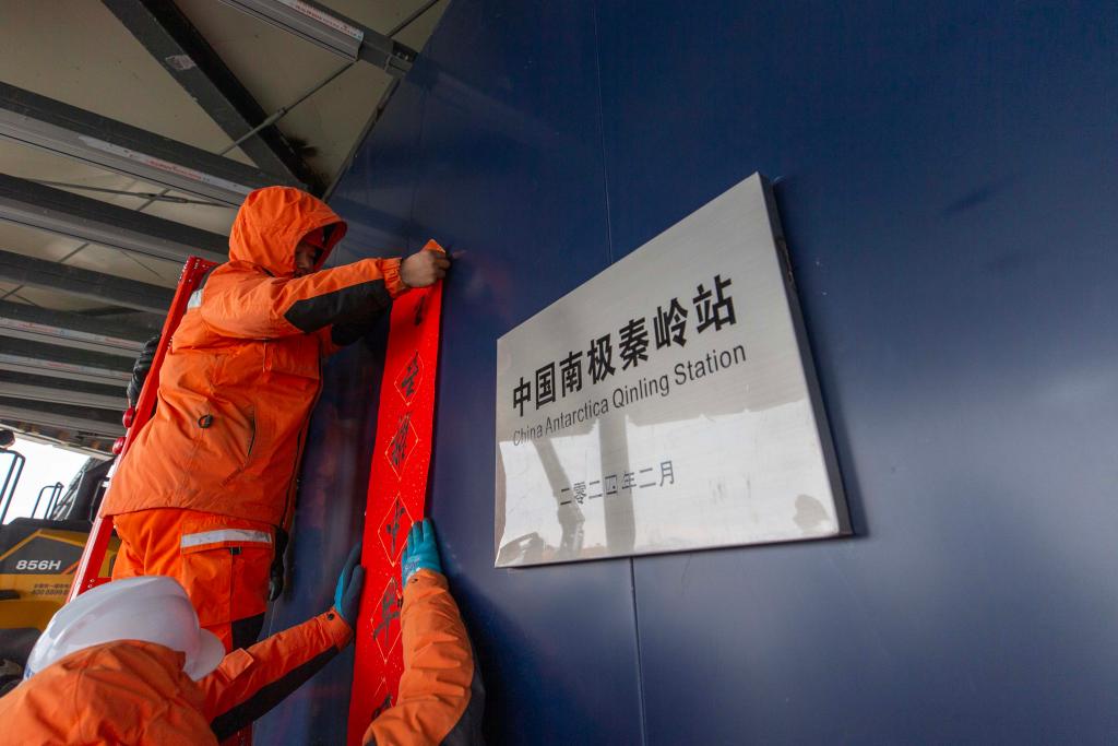 中國南極秦嶺站,中國第40次南極考察隊員正在貼對聯(lián)。新華社記者周圓 攝