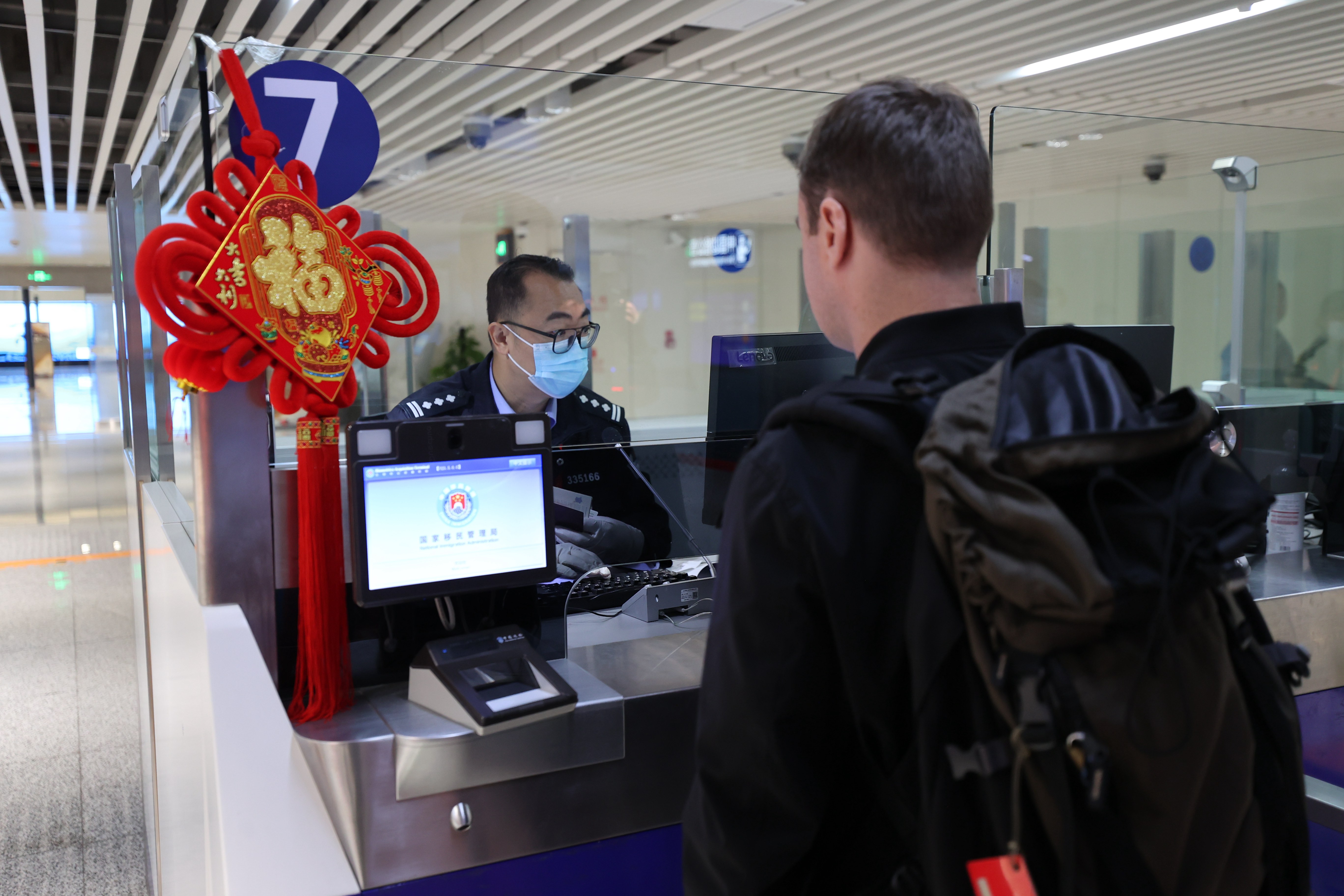 圖為執(zhí)勤民警為入境旅客辦理邊檢手續(xù)