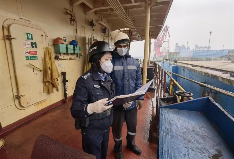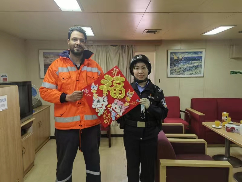 圖為執(zhí)勤民警陳嬌外籍船舶為船員送祝福賀新春。