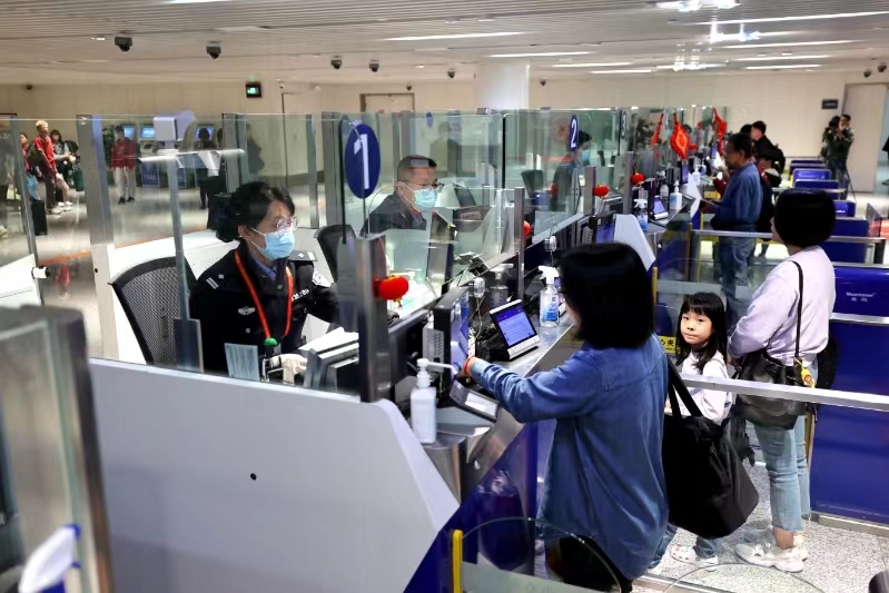 圖為執(zhí)勤民警為入境旅客辦理邊檢手續(xù)。