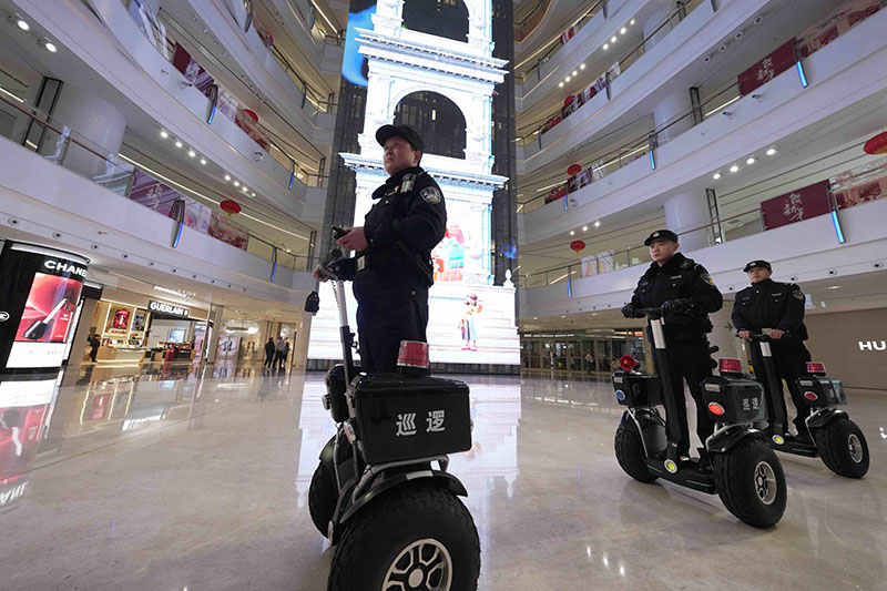 圖為湖北省武漢市公安局武昌區(qū)分局梅苑派出所民警駕駛平衡車在武商夢時代廣場內部巡邏。孫遜/攝